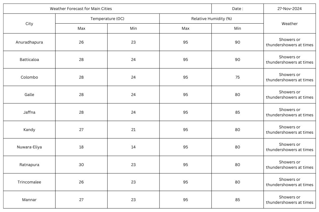 Showers or thundershowers will occur at times in Northern, North-central, Central, western and North-western provinces and in Trincomalee, Batticaloa and Kegalle districts. Very heavy showers above 150 mm are likely at some places.