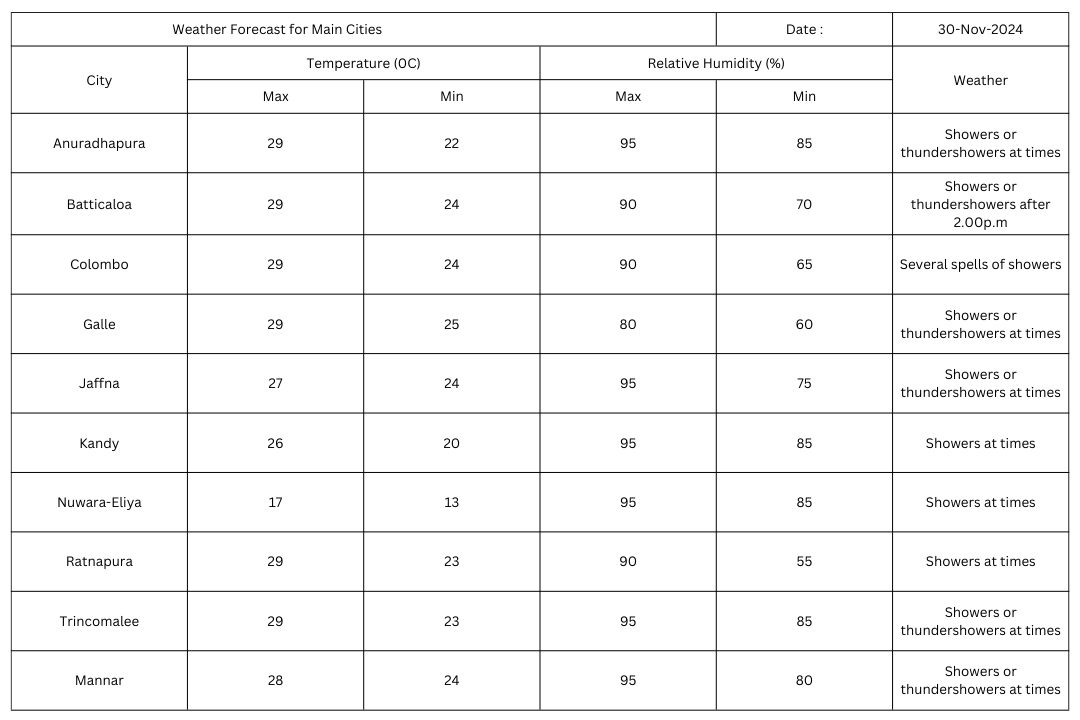 Showers will occur at times in Sabaragamuwa provinces and in Kandy, Nuwara-eliya, Galle and Matara districts. Several spells of showers will occur in Western, North-western and North-central provinces. Showers or thundershowers may occur at a few places elsewhere of the island in the evening or night.