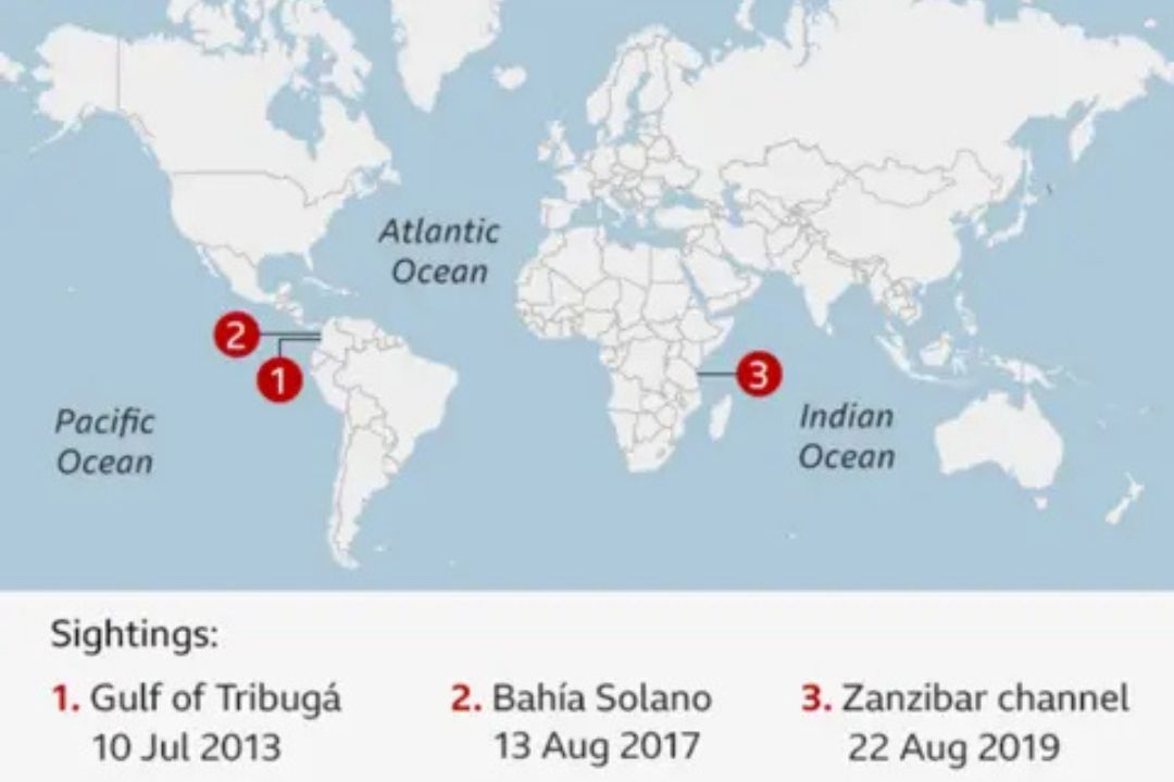 It was seen in the Pacific Ocean off Colombia in 2017, then popped up several years later near Zanzibar in the Indian Ocean – a distance of at least 13,000 km.