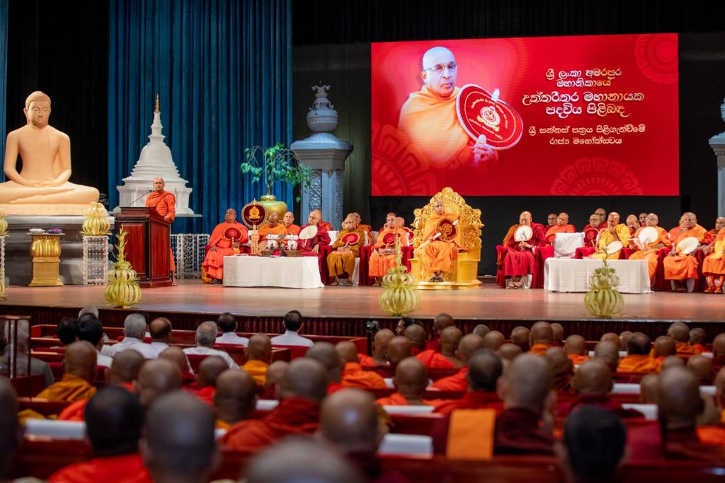 The ceremonial awarding of the ‘Sri Sannas Patra’ to the newly appointed Supreme Mahanayaka Thero of the Sri Lanka Amarapura Maha Nikaya, Most Venerable Karagoda Uyangoda Maithree Moorthi Maha Nayaka Thero, Chief Incumbent of the Rassagala Chapter and Balangoda Sri Dharmananda Vidyayathana Pirivena, was held yesterday (10) at the Bandaranaike Memorial International Conference Hall (BMICH) under the patronage of President Anura Kumara Dissanayake.