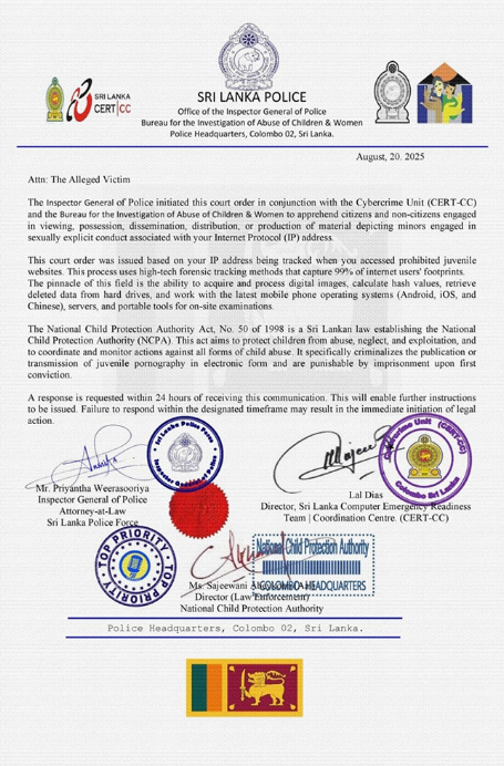 According to the Police, a fraudulent letter with a fake Sri Lanka Police letterhead, dated August 20, 2025, and titled “Attn: The Alleged Victim,” is currently being circulated on social media.