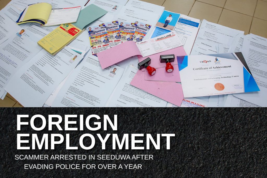 විදේශ රැකියා ලබාදෙන බව පවසා දිවයිනේ විවිධ ප්‍රදේශවල පදිංචිකරුවන්ගෙන් රුපියල් එක් කෝටි අසූ ලක්ෂයකට අධික මුදලක් වංචාකළ අඹු සැමි යුවළක් සීදූව ප්‍රදේශයේදී ශ්‍රී ලංකා විදේශ සේවා නියුක්ති කාර්යාංශයේ විශේෂ විමර්ශන අංශයේ පොලිස් ඒකකයේ නිළධාරීන් විසින් අද දින (10) අත්අඩංගුවට ගෙන තිබේ.