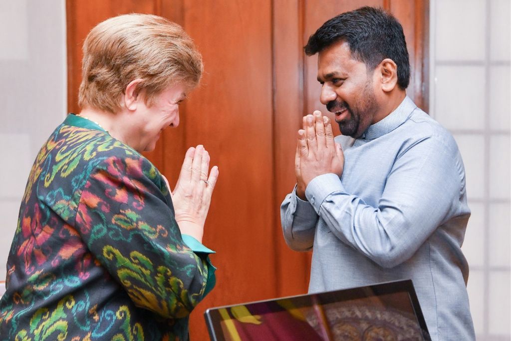 මෙරට තෙදින සංචාරයක නිරත ජාත්යන්තර මූල්ය අරමුදලේ (IMF) කළමනාකාර අධ්යක්ෂ ක්රිස්ටලිනා ජෝර්ජිවා (Kristalina Georgieva) මහත්මිය අද (17) පෙරවරුවේ ජනාධිපති කාර්යාලයේදී ජනාධිපති අනුර කුමාර දිසානායක මහතා හමු වූ අවස්ථාවේදී මේ බව සඳහන් කළාය.