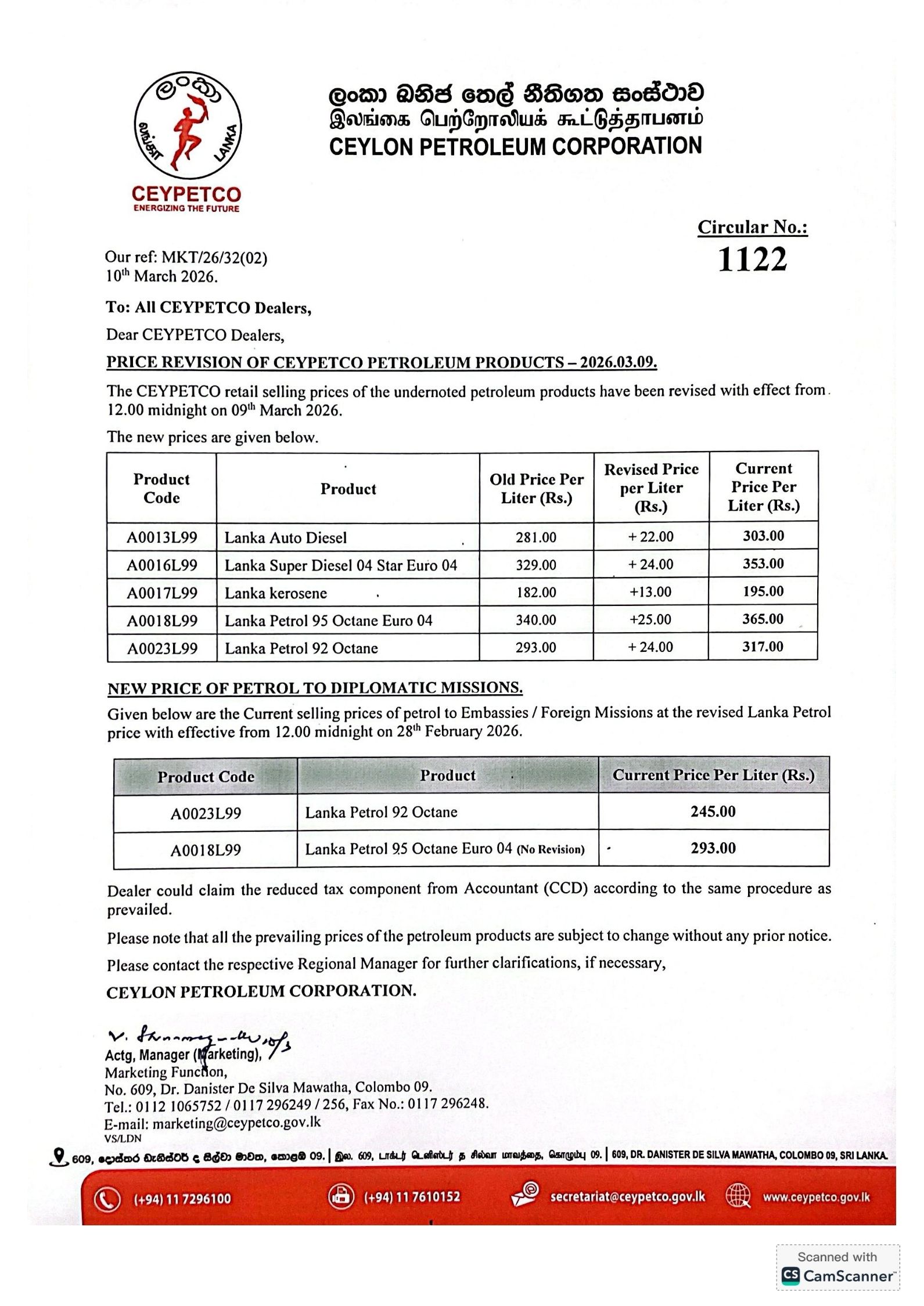 The Ceylon Petroleum Corporation (CPC) has announced a revision of fuel prices effective from midnight yesterday (09).